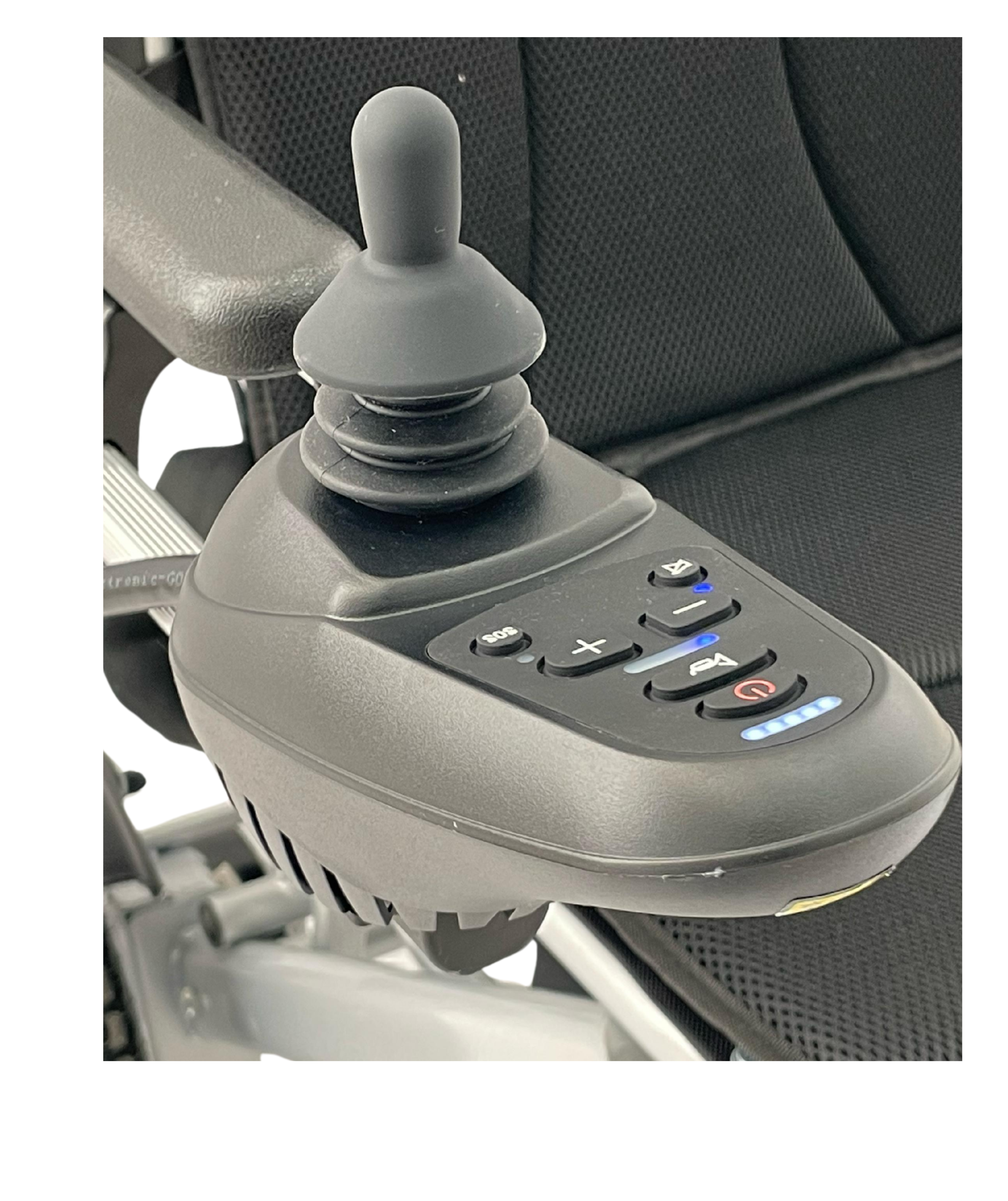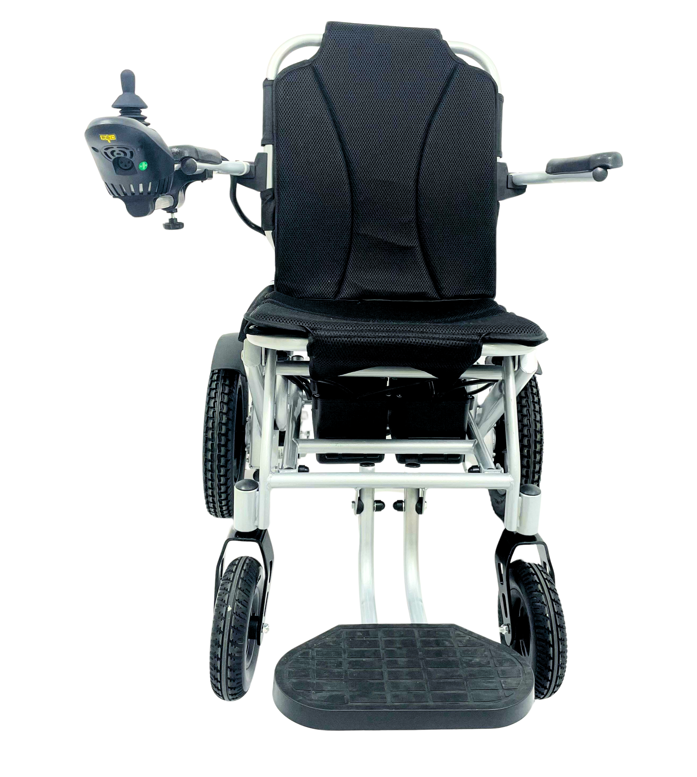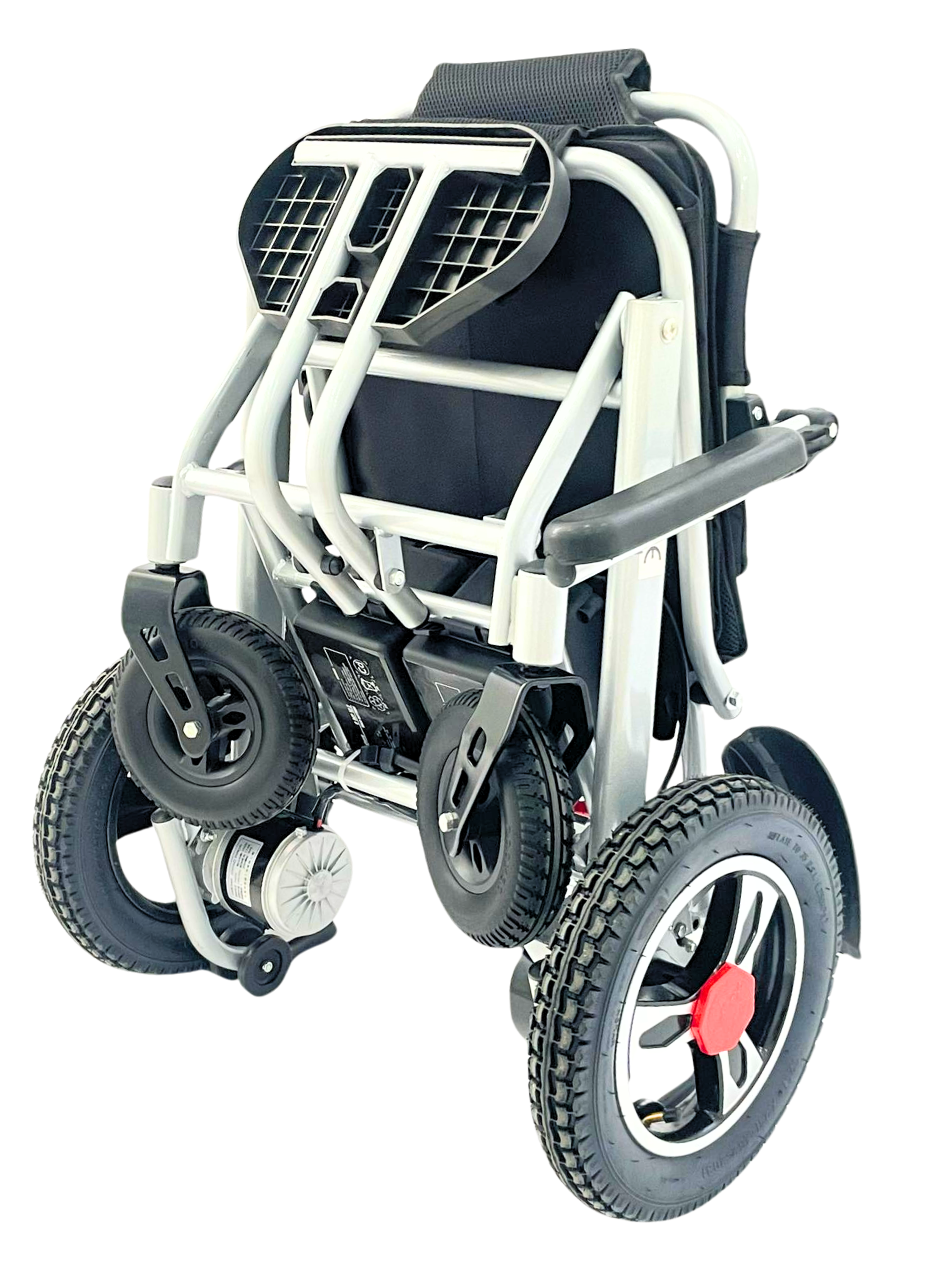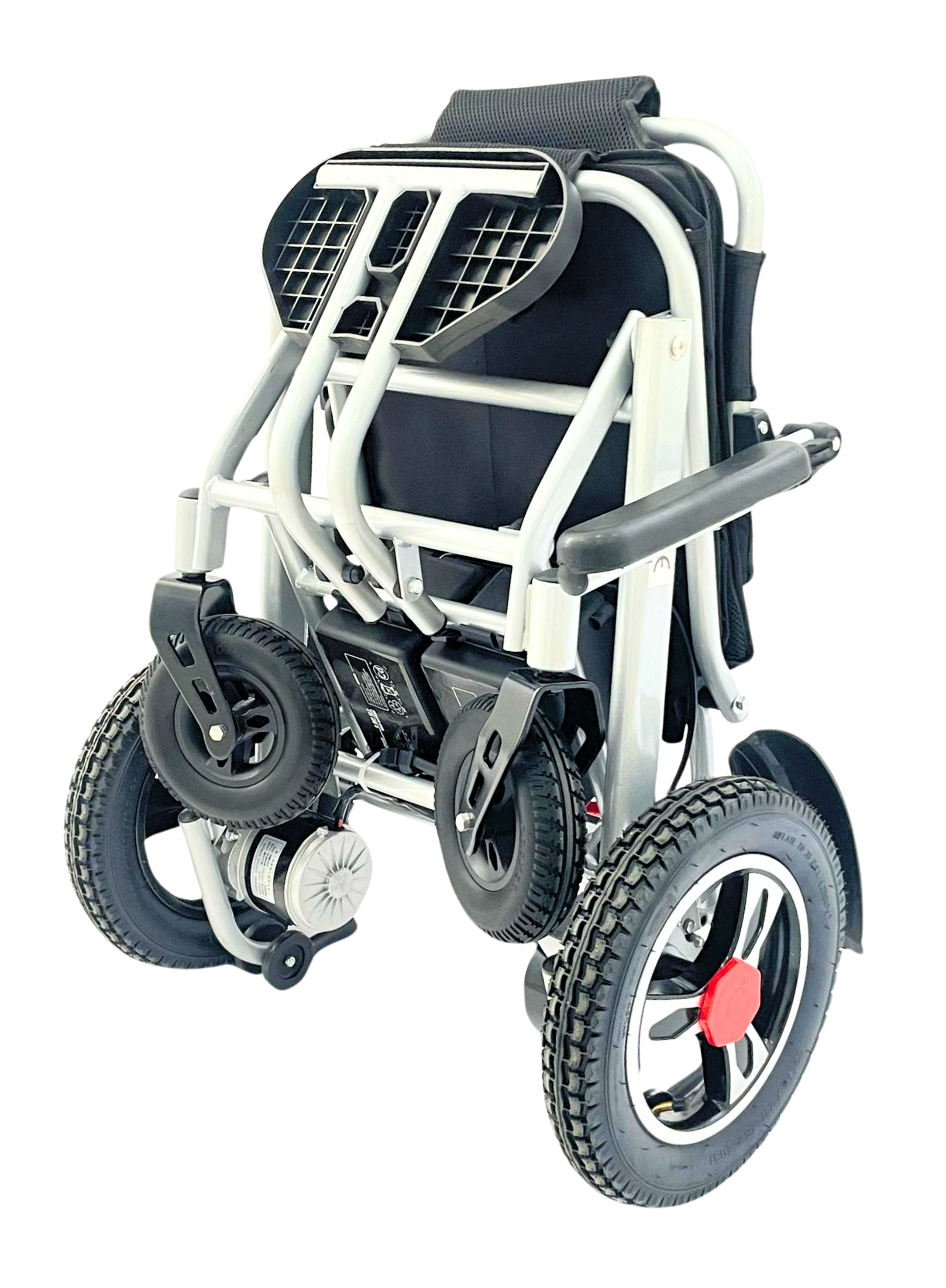 Lichtgewicht rolstoel van koolstofstaal (30 kg + 5 kg batterij), eenvoudig mee te nemen. Compact op te vouwen tot 58 x 43 x 100 cm. Past in kleine autokoffers en neemt weinig ruimte in beslag.